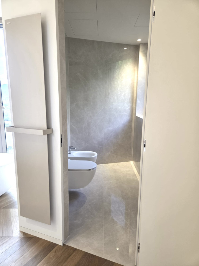 La zona giorno si apre su un ampio e raffinato living con cucina open space, impreziosita da una grande isola centrale con lavabo integrato e piano cottura a induzione. Dalla zona cucina si accede alla loggia coperta con affaccio sulla verde corte interna. Le ampie vetrate a tutta altezza del soggiorno creano una perfetta continuità tra interno ed esterno, conducendo alla spaziosa terrazza panoramica, ideale per momenti di relax e convivialità, sempre accompagnati da una magnifica vista lago.
