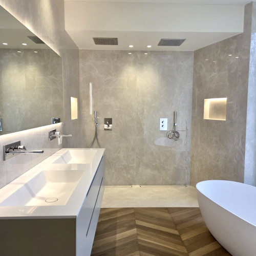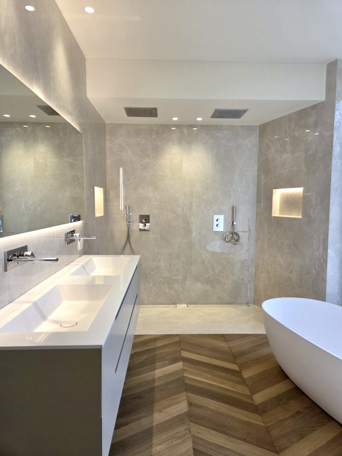 La zona notte è stata progettata per garantire il massimo del comfort e della privacy. Comprende due eleganti camere da letto, ampio bagno con doccia oltre a un secondo bagno di servizio. La master bedroom matrimoniale rappresenta un ambiente esclusivo e riservato, completato da un raffinato bagno en suite dotato di vasca e doccia doppia, concepito come autentico spazio dedicato al benessere e al relax, con zona toilette separata.